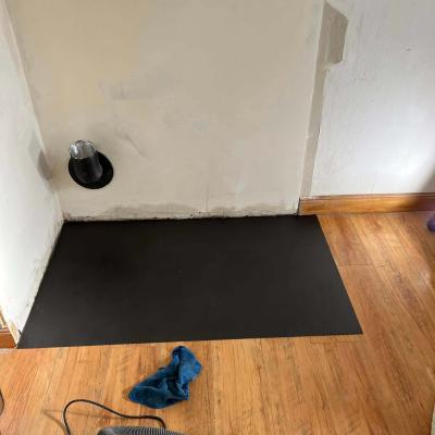 Pose d’une plaque de métal sur l’ancien emplacement afin de protéger le parquet